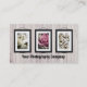Trois cadres de tableau accrochant sur un mur en bois de lamelle de lait de chaux. Employez les images de fleur ou changez pour votre propre illustration ou photographie. Les cartes de visite faits sur commande, se perfectionnent pour l'artiste, les photographes et plus. Ajoutez votre propre texte et code de QR (ou supprimez sinon nécessaire). Customisez pour plus d'options (couleurs de polices, positions, texte supplémentaire)