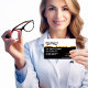 Cartes de visite Classy pour un Opticien ou un magasin optique conçu avec un élément de design de ton or dans une combinaison de couleur or noir et blanc qui donnent à ce design une touche de classe.