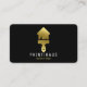 ces cartes de visite en carton or noir et métallique sont dotés d'un design unique et moderne qui se sent raffiné / haut de gamme et masculin, et sont très mémorables et captivants. L'arrière de ces cartes comporte un solide simulateur de silhouette métallique en or d'une brosse à peinture, avec des poils qui forment la forme d'une maison, accompagné de deux lignes de texte ci-dessous. La face des cartes comporte des couleurs de texte blanc et doré, ainsi que le même dégradé de métal doré imprimé simple silhouette de forme minimale graphique dans le coin supérieur droit.