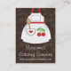Un carte de visite mignon et rétro de style avec un tablier rouge et blanc avec un coeur sur sa poche, une conception d'applique de cerise et la cuillère en bois sur un double ton de cerise et de marguerite sur l'arrière - plan de brun foncé de ton. Ces cartes de visite personnels sont parfaits pour un boulanger, un chef, un cuisinier, une boulangerie ou une société de restauration. Customisez-la pour dire celui que vous vouliez sur l'arrière et avant de la carte. © Chrissy H. Studios, LLC d'illustration. Tous droits réservés.