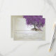Arbre fantaisiste et magique de l'amour, arbre aux feuilles en forme de cœur violet sur un papier métallisé à ton chaud argenté taché de thé avec une superposition de partitions de musique anciennes et quelques petits motifs tourbillonnants mignons pour mettre en valeur les racines de l'amour sur cette invitation de mariage unique en son genre sur le thème de la forêt.