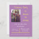 Image d'une fille qui fête son anniversaire et d'une princesse sur fond violet à l'avant avec les détails de la fête et des images de marguerites au dos.