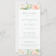 Elégante rose pastel, pêche, turquoise carte de programme de mariage floral présentant des pivoines délicates à l'aquarelle et un script de calligraphie simple minimaliste en couleur menthe. Parfait pour la fête en plein air du jardin botanique.