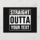 Cartes postales PERSONNELLES. Créez vos propres cartes DROIGHT OUTTA personnalisées. Design de typographie amusant avec de grandes lettres. Ajoutez votre propre ville, parodie ou citation à ce modèle / générateur de mèmes. Mème internet en noir et blanc pour hommes, femmes et enfants ados. Exemples personnalisés cool : Droit devant le lit. Tout droit de l'argent. Tout droit des idées. Juste en dehors du café. Juste en dehors de la prison. Juste devant la salle de fitness. Nom de la ville; compton chicago new york LA boston brooklyn. Amusants déménagement / nouvelles cartes d'adresse pour nouvelle maison.