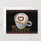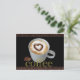 Ce design présente une photo d'un latte de mousse avec un coeur chocolat saupoudré sur le dessus. Le texte dit café, et il y a une bordure de fèves de café en haut et en bas.