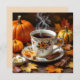Un carte pour notes thématique de Pretty Fall dit, "Envoi de bénédictions d'automne" pour un ami ou un membre de la famille. Illustration d'une scène d'automne avec une tasse de café chaud, des tranches d'orange, des citrouilles et des feuilles d'automne.