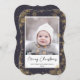 Script moderne Blue élégant Snowflakes Bokeh Minimalist Holiday Card. Envoyez des salutations de vacances personnalisables et personnalisées à vos amis, vos collègues et votre famille en cartes photos simples, minimalistes, élégants, amusants, festifs et modernes ! Un beau cadre de variété de flocons d'hiver dorés sur arrière - plan vert sauge entoure votre photo. Le message de bienvenue "Joyeux Noël" est écrit en calligraphie élégante, et ci-dessous présente votre message de bienvenue personnalisé de votre nom de famille dans la typographie moderne. Reverse pour révéler une belle les flocons de neige d'hiver d'or complet sur l'arrière - plan motif vert sauge.