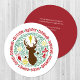 Fun Red Script Père Noël Reindeer Nom Noël Carte de vacances. Combien de rennes Père Noël a-t-il et quels sont leurs noms ? Envoyez des voeux et des salutations chaleureux à vos proches avec cette carte de vacances en forme de cercle mignonne et amusante avec tous les rennes volants magiques Père Noël avec des décorations colorées ornement de Noël en cercle rond design. Reverse pour révéler un message de salutation personnalisable et des noms dans beau arrière - plan rouge marron. Souhaitez-vous à tous des Vacances Joyeuses et un Nouvel An Extraordinaire !