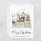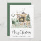 Carte de vacances d'inspiration boho illustrant une aquarelle d'un intérieur confortable de maison verte à la sauge décoré pour Noël avec une couronne, cheminée, rennes, arbre de Noël, bougies et gnomes. "Joyeux Noël" est écrit dans un script moderne et tendance. Ajoutez votre nom et l'année en typographie simple et moderne.