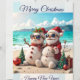 Une carte de vacances fantaisiste représentant deux bonhommes de neige joyeux sur une plage ensoleillée. L'un porte un chapeau de Père Noël et des lunettes de soleil, tandis que l'autre arbore des accessoires de fête. Ils sont assis côte à côte, entourés de petits sapins de Noël et d'ornements, avec une boîte cadeau.
