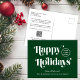 Carte postale de Noël d'entreprise verte pour vos clients, employés, affiliés, etc, avec "Happy Holidays" dans la typographie blanche stylisée, le logo de votre entreprise et votre nom d'entreprise dans la simple typographie blanche moderne. À l'arrière, ajoutez un message saisonnier personnalisé d'appréciation et de remerciements et entrez votre adresse de site Web pour créer un code QR que les clients peuvent analyser pour se connecter à vos plates-formes en ligne.