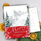 Carte postale moderne Red Pine Tree Snowflakes Bokeh Chic Script Minimalist Holiday. Souhaitez-vous à tous un Joyeux Noël et Bonne Année!