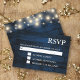 Carte RSVP de mariage rustique avec un arrière - plan en bois verni avec lampes à cordes. La date de RSVP par a une zone de texte marquée pour vous aider à la customiser pour votre journée.