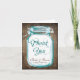 Il a une conception bleue de pot de maçon de turquoise d'aqua turquoise sur un arrière - plan brun affligé. Il a également l'écriture de fantaisie de manuscrit des mots "Merci" dans le blanc. L'intérieur est vide. Ce sont parfaits pour le mariage campagnard vous remercient des cartes.
