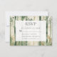 Cette élégante carte de mariage moderne RSVP dispose d'un paysage forestier rustique aquarelle arrière - plan dans les tons vert et or Le texte personnalisable en gris fusain apparaît sur un écran blanc rectangulaire. La scène boisée est répétée sur le dos de la carte.