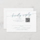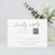Cette carte rsvp chic et chic boho turquoise et blanc dans et code QR est parfaite pour un mariage minimaliste. Le design bohème moderne bleu vert et blanc présente une calligraphie rustique simple avec un style unique mais classique qui rappelle la plage côtière et une croisière d'été sur l'océan. Donnez à vos invités la possibilité de poster dans leur carte rsvp, ou simplement répondre en ligne avec cette carte de réponse de code QR. Entrez votre adresse Web dans la section de code QR du modèle et le code QR sera automatiquement mis à jour et lié à votre site.