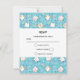 Une carte RSVP avec un motif chat mignon, posée sur un arrière - plan bleu et décorée avec des arcs-en-ciel et des empreintes de pattes et plus encore.