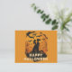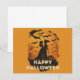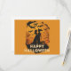 L'image montre deux personnages fantômes, une sorcière avec chapeau, et une autre créature, qui se font face en douce avec une lune pleine. Entourée de chauves-souris volantes et d'arbres chauds, la scène diffuse une atmosphère mystique et effrayante. La couleur orange-brune renforce la sensation d'automne et d'Halloween, tandis que les mots "HAPPY HALLOWEEN" véhiculent un message joyeux au milieu de l'ambiance sombre.