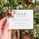 This romantic and classic Christmas or winter-themed RSVP card design features a cluster of vibrant red and white winter flowers, pine, holly berries and rustic twigs, custom modern text graphics and editable text fields.