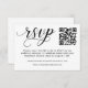 La conception moderne de carte de réponse mariage noir et blanc présente RSVP en script élégant avec votre code QR personnalisé, le site Web mariage et l'adresse e-mail en option afin que les clients puissent répondre en ligne plutôt que de renvoyer une carte. Le texte noir et la couleur blanche arrière - plan peuvent être mis à jour pour correspondre à votre jeu de couleurs mariage.