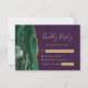Le bord gauche de cette élégante carte de mariage moderne RSVP est doté d'une bordure en aquarelle vert émeraude, ornée d'une parties scintillant en faux or. Le texte est en écriture manuscrite de couleur or et la police de cuivre sur un arrière - plan violet profond. L'envers est assorti d'un design d'agate vert et or.