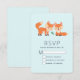 Carte RSVP avec une illustration graphique de 2 renards oranges à l'air mignon et heureux. Arrière - plan bleu clair.