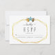 Polygon en feuille d'or et coquillages d'été mariage plage mariage RSVP carte. Il dispose d'un cadre polygonal doré avec votre texte et trois coquilles d'aquarelle en beige et bleu sur la partie supérieure. Le dos est de couleur bleu foncé.