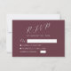 Cette élégante carte de réponse de mariage moderne comporte un texte blanc sur fond bourgogne. Le titre "RSVP" apparaît dans une belle écriture calligraphique, avec un texte personnalisable ci-dessous dans une police sans serif. Le verso est de couleur bourgogne uni.