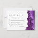 Le bord droit de cette élégante carte d'enceinte RSVP de mariage moderne présente un design de géode d'aquarelle violet, orné d'une fausse parties scintillant argentée. Le titre "Kindly Reply" apparaît dans une police de caractères romaine serif, avec le texte personnalisable ci-dessous en police de caractères gris fusain sur un arrière - plan blanc. Une agate violette et argentée assortie apparaît sur le dos.