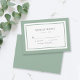 Cette carte de mariage classique moderne RSVP comporte une couleur modifiable; pour changer la couleur de la bordure et de l'arrière - plan arrière de la couleur verte sauge à la couleur de votre choix, cliquez sur le bouton personnaliser et changez simplement la couleur de l'arrière - plan avant et arrière. Personnalisez-le en remplaçant le texte de l'espace réservé. Pour plus d'options comme changer la police, sa taille et l'espacement entre les lettres cliquez sur le bouton "Personnaliser". *Veuillez noter que le filigrane Zazzle qui apparaît dans l'aperçu du zoom n'apparaîtra PAS sur le produit imprimé final. © Bois de rose et agrumes
