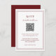 Carte RSVP de style classique / mariage bordeaux avec un design simple et minimal avec un code QR en option et des détails entourés d'une double bordure (si vous préférez, vous pouvez supprimer le code QR dans l'outil d'édition de conception). Les fontes alternent entre un script élégant, une fonte serif traditionnelle et minimaliste sans serif. Cette carte de réponse est idéale pour un mariage officiel.
