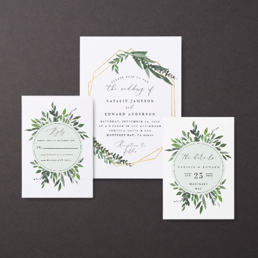 design moderne audacieux avec un cadre géométrique doré et un beau feuillage aquarelle. Cette élégante collection rustique est un excellent ajout à un mariage d'automne ou de printemps et comprend tous les produits dont vous aurez besoin pour votre jour spécial - cartes de sauvegarde, invitations, plans de table et plus encore.
