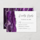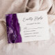 Le bord gauche de cette élégante carte de réponse de mariage moderne présente une bordure d'agate aquarelle violette ornée de paillettes argentées factices. Le titre "Répondez s'il vous plaît" apparaît dans une écriture calligraphique moderne, avec un texte personnalisable ci-dessous en police sans empattement gris charbon sur fond blanc. Le verso présente un motif d'agate violet et argent assorti.