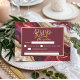 Complétez votre suite de mariage avec cette carte de réponse RSVP bourgogne et or élégante, dotée d'un fond en marbre agate luxueux et d'un cadre or raffiné. Conçue pour les mariages modernes, cette carte de réponse chic et sophistiquée permet à vos invités de répondre avec style. Un parfait mélange d'élégance et de glamour, elle donne le ton pour une célébration inoubliable.