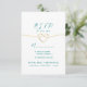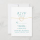 Carte de réponse de mariage sarcelle moderne, minimaliste et élégante avec cœur de corde dorée et calligraphie simple manuscrite.