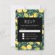 Carte RSVP avec un joli motif avec des citrons et des fruits de citron vert avec des tiges de feuilles posés sur un arrière - plan vert foncé.