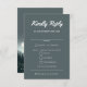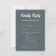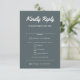 Une carte de réponse simple avec de l'espace pour 3 options de dîner pour vos invités et une ligne pour une demande de chanson ou d'allergie alimentaire. Nous sommes heureux de vous customiser plus loin, n'hésitez pas à nous envoyer un message d'assistance.