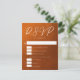 Suivez la tendance d'automne des tons terreux avec notre carte RSVP mariage de automne couleur orange brûlé à brun. Une simple typographie blanche sur un arrière - plan rustique pour un look minimaliste. Les teintes bohèmes évoquant l'argile de terre cuite mettent en valeur votre choix de repas sur cette carte colorée à la mode.