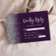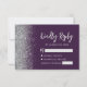 Le bord gauche de cette élégante carte d'enceinte RSVP de mariage moderne comporte une bordure en faux parties scintillant argenté. Le texte personnalisable combine écriture manuscrite gris argent et police sans serif sur un arrière - plan violet foncé. L'envers est assorti d'un design violet et argenté.