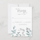 Cette simple carte de réponse de mariage de jardin moderne de verdure présente une demoiselle/dragonfly aquarelle dans des nuances de bleu et de vert avec des ailes iridescentes. Elle repose sur un arrangement simple de verdure de jardin aquarelle naturelle dans des nuances de vert, de bleu, de gris et de marron sur fond blanc. Le dos est un gris uni qui correspond au texte.