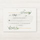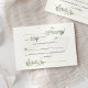Carte de réponse RSVP de mariage moderne, propre et sophistiquée avec illustration feuille de feuillage vert aquarelle et une fine ligne géométrique or.