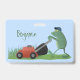 Ein lustiger grüner Frosch, der den Rasen im albernen Cartoon-Stil mäht.