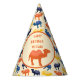 Feiern Sie Geburtstage und andere ganz besondere Events mit diesen Party-Hüten, die im Stil eines Cartoon ein Bactrian-Kamel oder ein Kamel mit zwei orangefarbenen Höckern vor einem wüstenfarbenen sandfarbenen Hintergrund mit einer eigenen personalisierten Botschaft und einem überwältigenden Kamelmuster in Blau, Orange und Gelb darstellen.