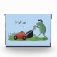 Ein lustiger grüner Frosch, der den Rasen im albernen Cartoon-Stil mäht.