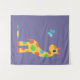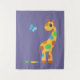 Gemütliches Beispiel einer niedlichen Giraffe aus Cartoon mit mehrfarbigen Flecken und einem kleinen Schmetterling.