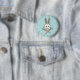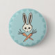 Lustiger Knopf, der eine Cartoonillustration eines niedlichen Kaninchenschädels und -gekreuzter Knochen als Karotten auf aquamarinem kennzeichnet.