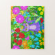 Eine Cartoonkatze, eine Originalvorlage eines lächelnden lila Pussycat mit grünen Augen in einem Fantasiegarten der hellen Blumen einschließlich Rote Rosen, der großen rosa Blumen, orange sternförmige Blumen und andere fantasievolle Flora, mit niedlichen Marienkäfern und bunte Schmetterlinge von Blauem, von Lila, von Rotem, von Gelbem, von rosa und Orange. Es gibt sieben wunderliche Schmetterlinge und drei Marienkäfer im Garten.