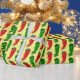 Cartoon rot und grün Paprikaschoten posieren für ein Bild. Originelles Design auf gelbem Hintergrund. Maßgeschneiderte Geschenkpapier-Rollen. Geschenkpackidee für würzige Fressliebhaber.