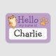 Niedliche Illustration auf einem lila Hintergrund einer Orangenkatze, die auf einem Hinterbein stehend ist und das andere Bein hinter ihr gehoben hat. Ihre Vorderbeine sind bis zu ihren Seiten gestreckt. Sie hat zwei dunklere Streifen auf ihrem Kopf und einen hellen Bauch und Wangen. Mit großen dunklen Augen und einem fröhlichen Lächeln ist dieses Kätzchen bezaubernd. Dieses Bild ist oben verlassen vom Abzeichen und ein orangefarbener Pfotendruck oben rechts. Zwischen den Bildern sind die Worte "Hallo mein Name ist" in einem dunklen lila. Unter dem Bild in einem weißen Feld ist eine Vorlage in lustiger schwarzer Schrift, um Ihren Namen zu diesem Abzeichen hinzuzufügen, oder Sie können den Namen ganz zu löschen, um leer verlassen. Eine niedliche Ergänzung für diese ersten Eindrücke.