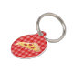 Cartoon Pizza Slice mit drei Salamis auf einem roten Gingham Muster Hintergrund. Auf der anderen Seite gibt es anpassbare Textbereiche für den Namen des Tieres und für eine Telefonnummer.
